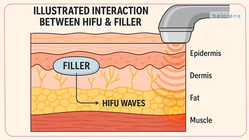 يعمل الفيلر بشكل موضعي في الطبقات السطحية من الجلد أو تحتها مباشرة، وهو لا يتداخل مع العمليات العميقة التي يعالجها الهايفو. ومع ذلك يمكن أن تؤثر حرارة الهايفو على الفيلر في بعض الحالات. يرسل الهايفو موجات فوق صوتية مكثفة إلى الأنسجة العميقة التي قد تصل إلى المناطق التي تحتوي على الفيلر. وإذا تم تطبيق العلاج في نفس المنطقة التي تحتوي على الفيلر فإن الحرارة يمكن أن تؤدي إلى تفاعل مع المادة المحقونة.
